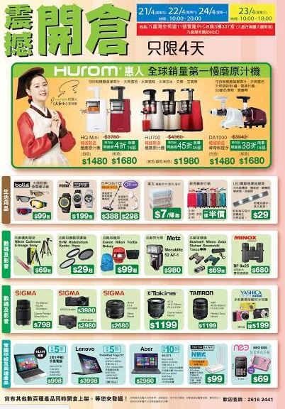 4天Crazy Sales震撼 減!減!減! 今次開倉會有韓國HUROM惠人慢磨原汁機、SAMSONITE新秀麗旅行箱、ODA小田蒸汽拖把、潔玉毛巾用品、TOTOLINK網絡路由器、ACER / LENOVO 手提電腦、FujiX手提及平板電腦(HKD298起)、數碼相機、鏡頭及腳架、望遠鏡及其他家居家電用品等,全部產品一律開倉清貨減價,會場貨品種類數以百計未能盡錄,唔好錯過啦!