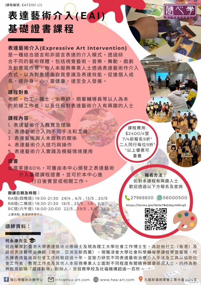 2021年度(第二輪)表達藝術介入(EAI)基礎證書課程現正接受報名,對表達藝術作介入手法有興趣的人士歡迎報名參加。