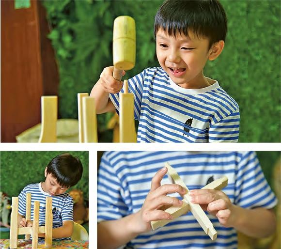 一般木工製作時間為3小時,2歲以上小朋友便可以參加。一張看上去非常結實的小木椅,組裝過程並不複雜,有些款式可能需要用螺絲,有些則只需如砌積木般,以膠水和榫口接駁即可,很多步驟連3歲的孩子都做得到。而最令孩子們期待的,除了DIY,還有做完手工後可以到旁邊的波波池內盡情放電。很多小朋友來到時,都忍不住想跑進波波池裏,Ingrid說這時候最能訓練小朋友的耐性,「DIY時間因人而異,但一般2小時內都可以完成,家長可以告訴孩子,要努力做完成品,便可以到裏面玩,我發覺這樣會令他們DIY時更專注,想快點把手頭上的工作做好」。