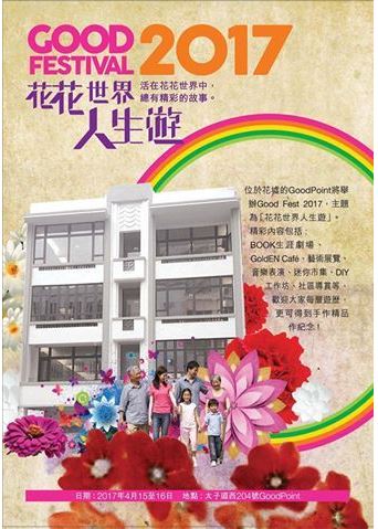 不管我們在人生的什麼階段, 活在花花世界中,總有精彩的故事。 位於花墟的 GoodPoint來緊復活節將再度舉辦 Good Fest 2017,主題為「花花世界 人生遊」,不同單位以活動說出人生故事,精彩內容包括:話劇、真人圖書館、藝術展覽、音樂表演、迷你市集、DIY工作坊、社區導賞等。 合辦團體:香港社會服務聯會、GoodPoint、金齡薈、HKYTI、走馬燈、天經地義生活館、五季禪食