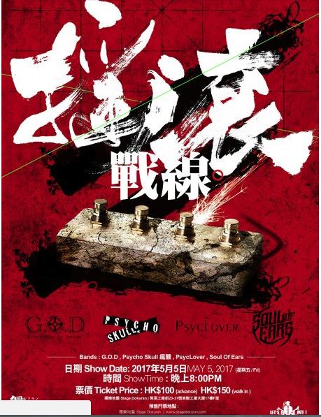 搖滾戰線II “2017年再次集結 凝聚搖滾魂!!!!” 樂隊G.O.D ,PSYCHO SKULL瘋髏,PSYCLOVER , SOUL OF EARS 四支本地不同風格樂隊將於5月5日集合 “獨樂地盤”强勢拉開初夏搖滾戰慢!!!! 絕對不能錯過!!!!!!!!!