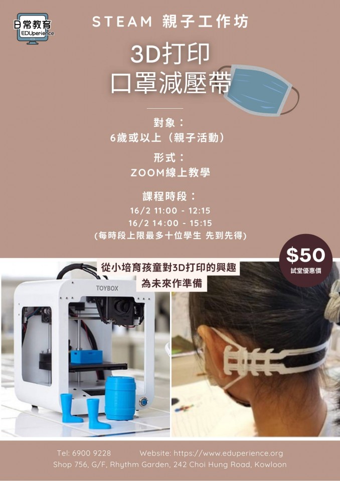 3D打印技術正在高速發展中,應讓孩童及早認識未來科技趨勢,為孩童嘅未來作好全面準備。適逢疫情嚴峻時期,日常教育特意以優惠價推出3D打印口罩減壓帶工作坊,減輕口罩為耳朵帶來的不適及壓力。在課堂中學生可了解到3D打印技術的原理及參與製作流程,有別於平時死板的課堂,寓學習於娛樂!
